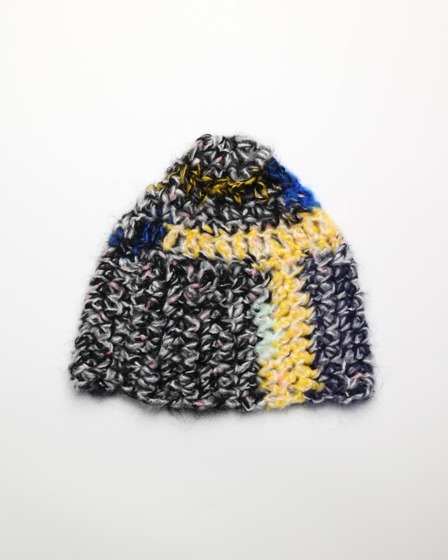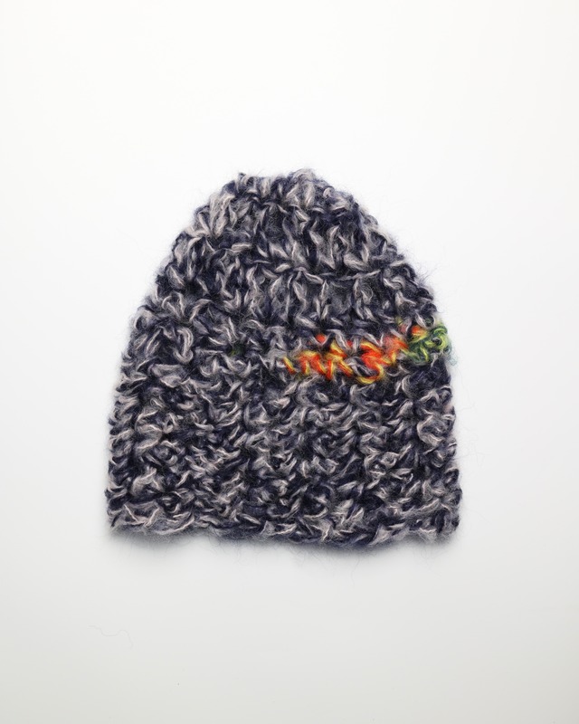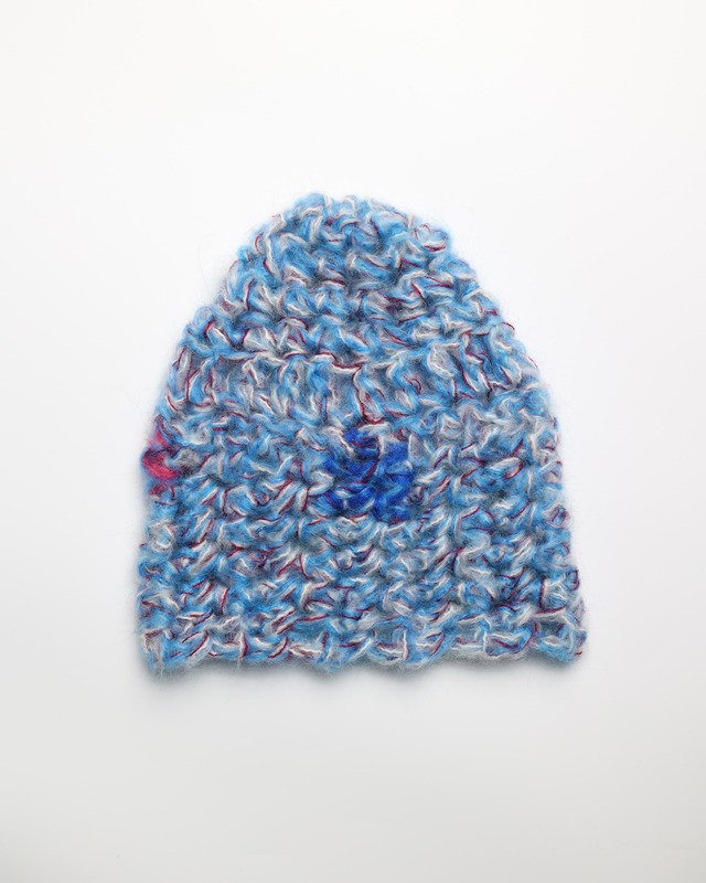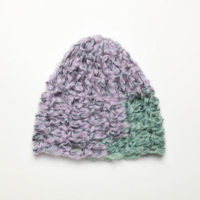 size 25×24 一点物 日本製モヘア毛糸とツイードモヘアを贅沢にミックスしたニット帽。複数のモヘアを重ねて編むことで生まれる、奥行きのある質感と色合い。 一点一点表情の異なる、特別な仕上がりです。 A hand-knitted beanie made from a luxurious blend of Japanese mohair and tweed mohair yarns. Layered mohair threads create rich texture and depth of color. Each piece is unique.